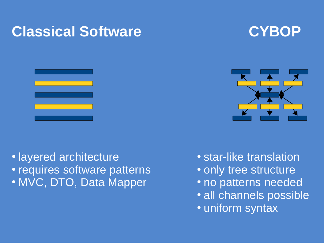 For programming, CYBOP offers exactly the same: One framework (schema, container) for all applications. Only the knowledge contained differs.
